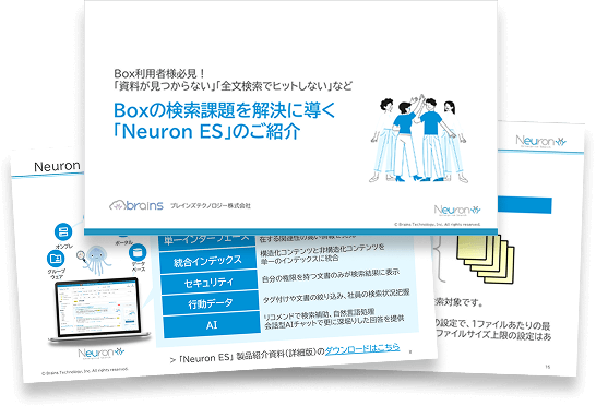 実際に社内で「Box」を利用しているが、「目的の資料探しに時間がかかる…」などのお困りがございましたら、ぜひ「Neuron ES」の導入をご検討頂けますと幸いです。
