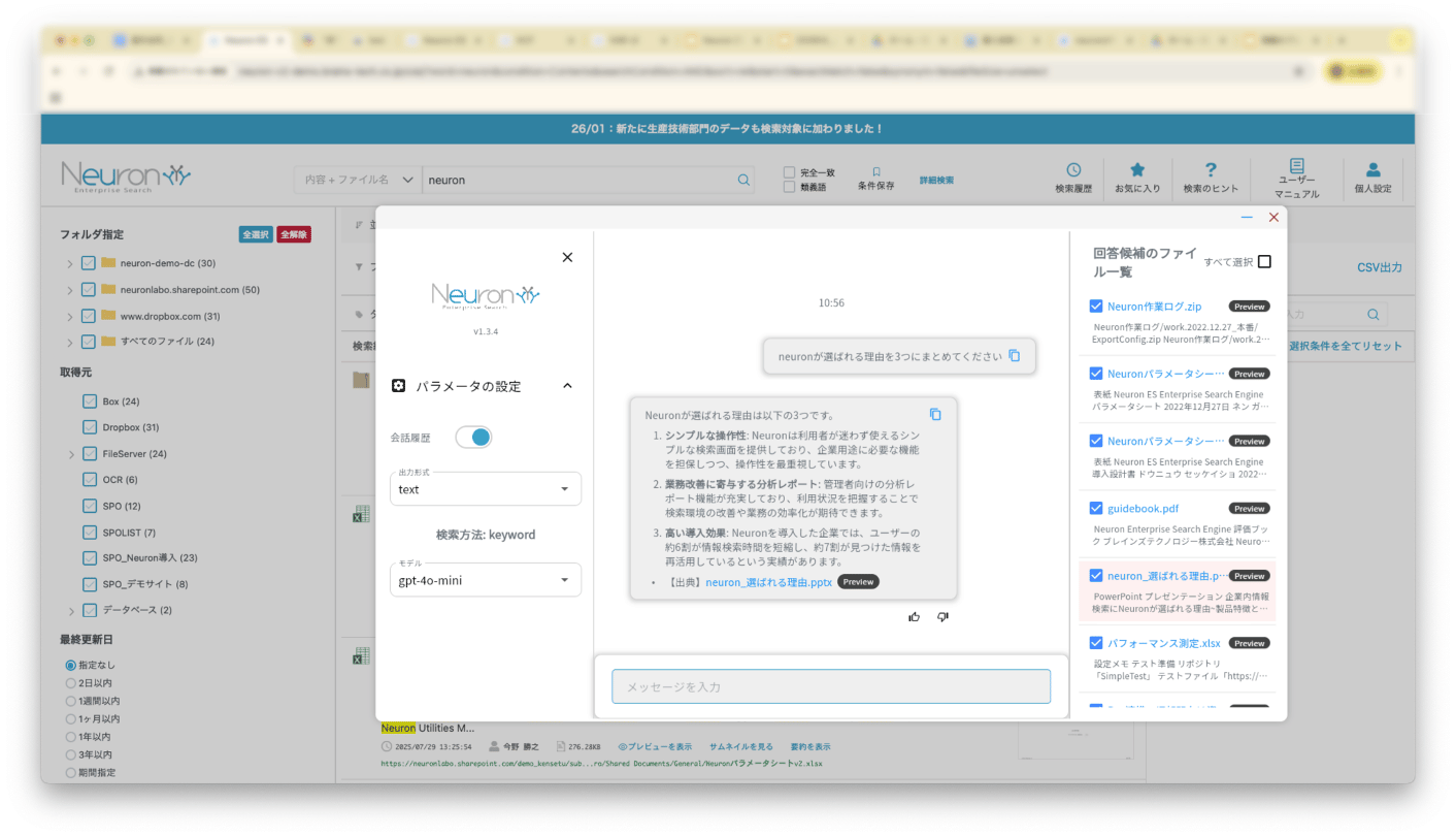Neuron ESと生成AIとを連携することで、情報の要約やAIチャットが行える「生成AI連携機能」