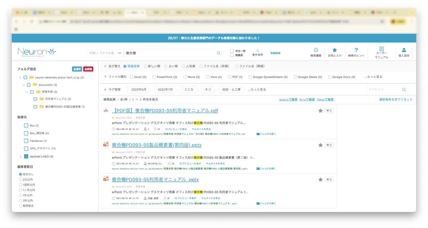 ネオジャパン社のグループウェア「desknet’s NEO」が新たに検索対象に加わりました。(パッケージ版の「文書管理」が対象)