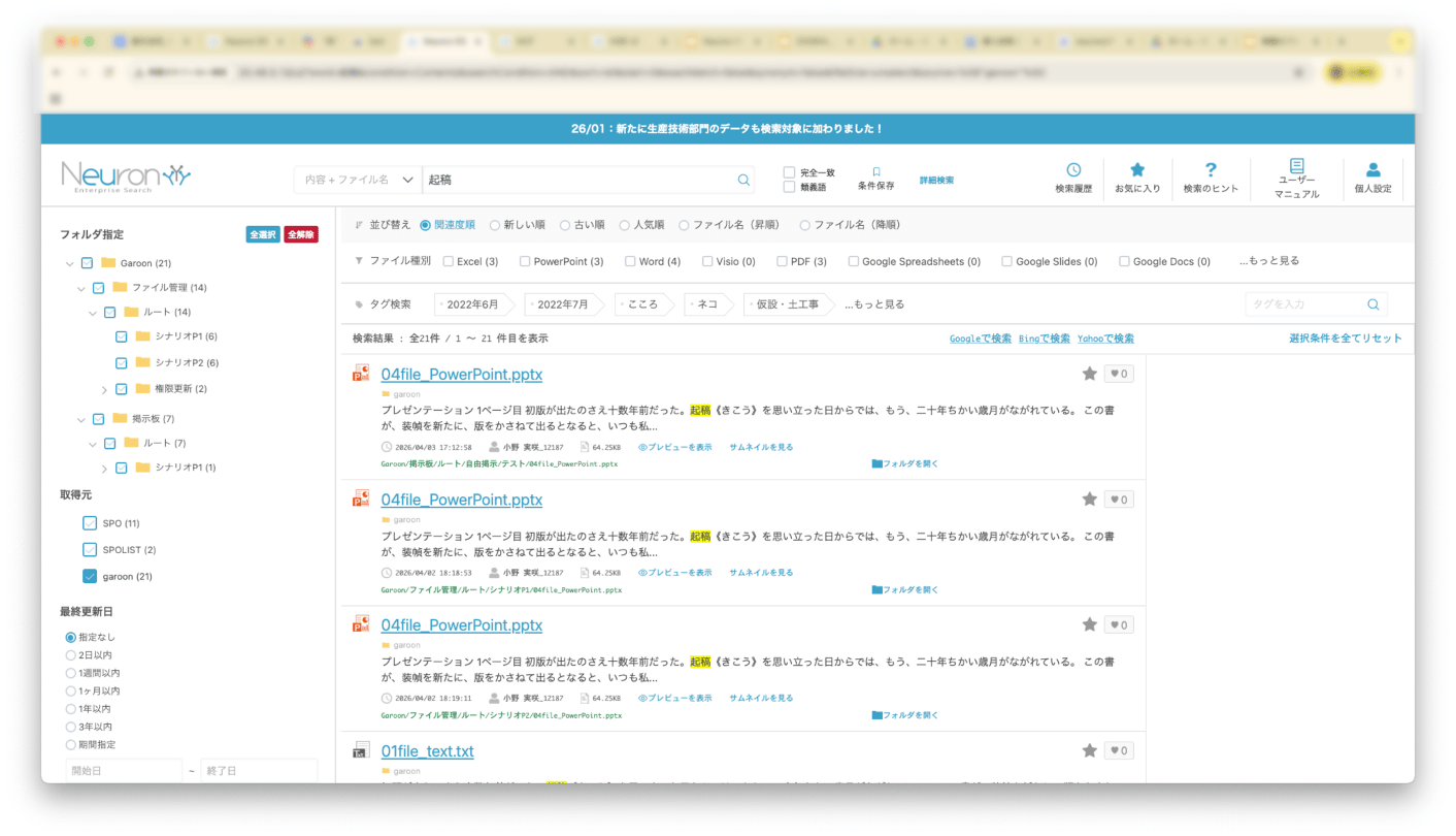 サイボウズ社のグループウェア「Garoon(ガルーン)」も新たに検索対象に加わりました。(パッケージ版の「ファイル管理」「掲示板」が対象)