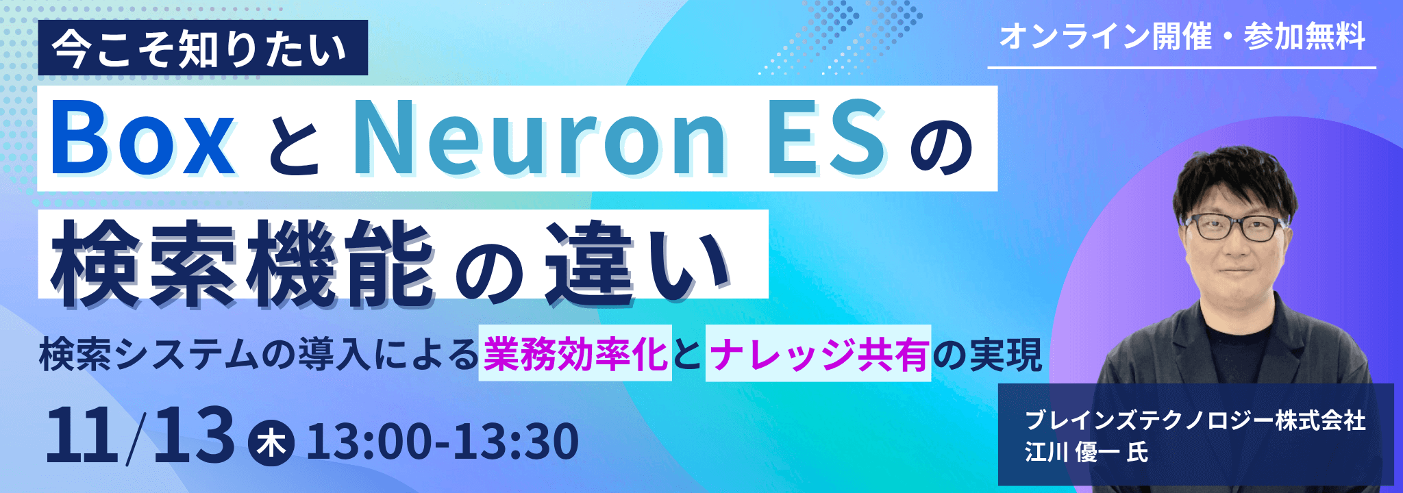 本セミナーでは、コンテンツクラウド「Box」と企業内検索システム「Neuron ES」の検索機能の違いや実際に「Box」を利用する各社での具体的な導入効果をご紹介いたします。