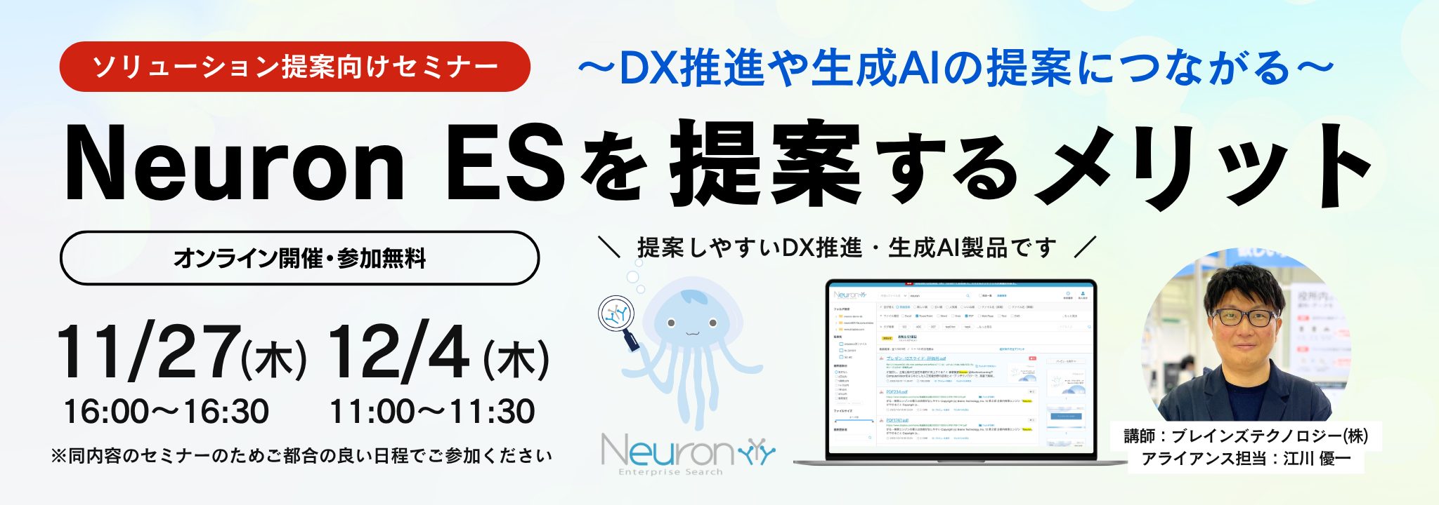 本セミナーでは、ソリューション提案企業の皆さまを対象に「Neuron ES」の基本機能はもちろん、提案先のお客様にとっての導入価値、刺さるセールストークについてお伝えさせていただきます。ぜひお気軽にご参加ください。